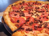 Canadian bacon, crumbled Italian sausage, Genoa salami, pepperoni, ground beef, bacon & sliced spicy Italian link sausage.